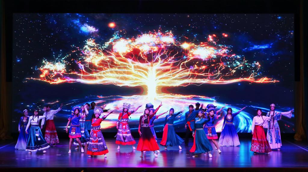 此次文艺汇演共分为“青青子衿 志怀家国”“灼灼风华 奋楫笃行”“莘莘学子 向阳追梦”三个篇章,兼具家国情、师生情与同窗情。第一篇章“青青子衿 志怀家国”中,开场舞《风华盛茂》用默契舞姿共叙“民族团结一家亲”的温暖情谊;《领航》《觉醒》两首歌曲,带领现场师生重温党的百年征程,感受青年担当;歌舞《光亮》更是以动人的旋律和优美的舞姿,诠释了理想与信念的力量,让家国情怀在舞台上缓缓流淌、浸润人心。